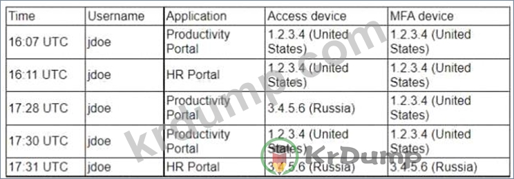 보안 분석가는 특정 사용자에 대한 여러 번의 MFA 로그인 성공에 대한 경고를 받았습니다. 분석가는 인증 로그를 검토할 때 다음 사항을 확인합니다.