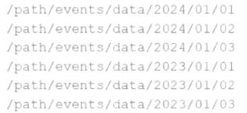 데이터 엔지니어는 상류팀에서 매일 밤 제공하는 Parquet 파일 세트에 대한 수집 파이프라인을 구축해 달라는 요청을 받았습니다. 데이터는 기본 경로가 "/path/events/data"인 디렉터리 구조에 저장됩니다. 상류팀은 일별 데이터를 관례에 따라 년/월/일 하위 디렉터리에 저장합니다.