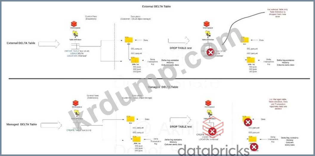 SQL Command DROP TABLE table_name을 사용하여 외부 DELTA 테이블을 삭제하면 메타 데이터(델타 로그, 기록) 및 저장소에 저장된 데이터에 어떤 영향을 줍니까?