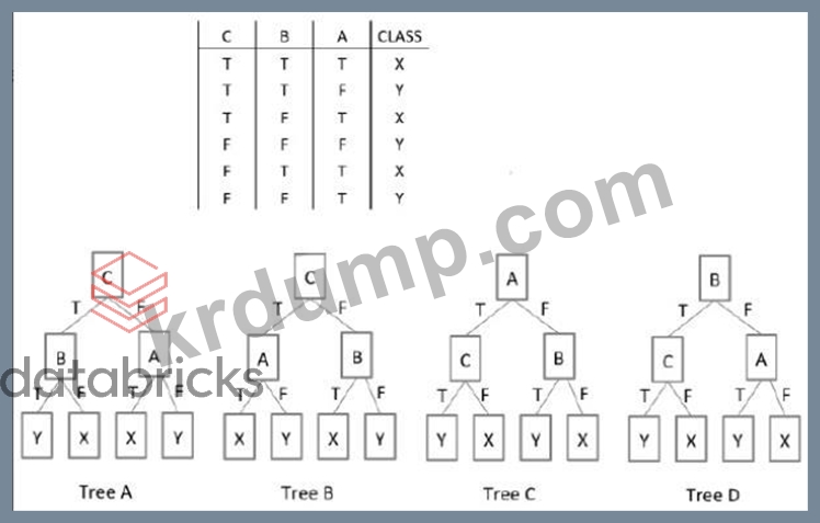 Exhibit에서 테이블은 입력 부울 속성 "A", "B" 및 "C"에 대한 값을 보여줍니다. 또한 출력 속성 "class"에 대한 값도 표시합니다. 데이터에 유효한 의사 결정 트리는 무엇입니까?