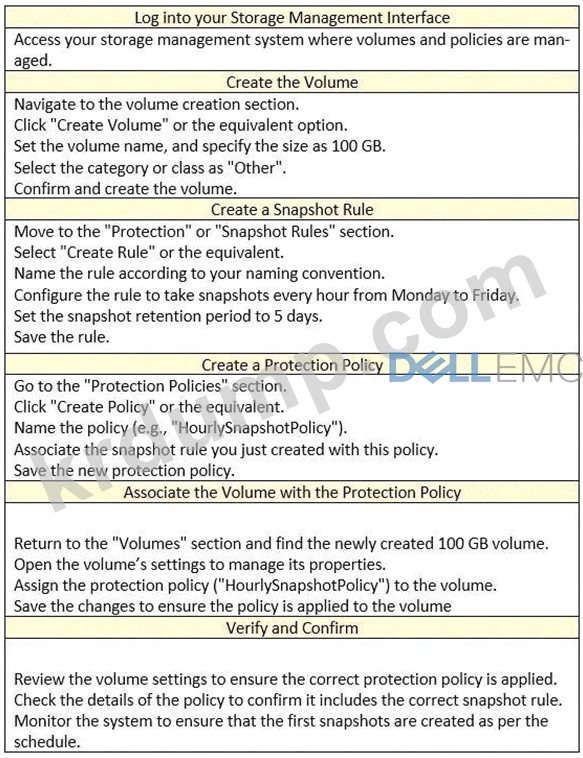 시뮬레이터를 사용하여 100GB의 새 볼륨을 생성하세요. '기타' 범주를 사용하세요. 새 볼륨을 월요일부터 금요일까지 매시간 스냅샷을 생성하고 5일 동안 보관하는 규칙이 포함된 보호 정책과 연결하세요.