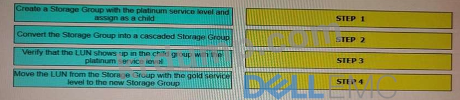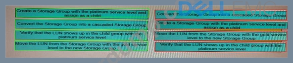 호스트에 하나의 일반 스토리지 그룹이 포함된 마스킹 보기를 통해 할당된 LUN이 있습니다. 스토리지 그룹에 골드 서비스 수준이 할당되어 있습니다. 하나의 LUN에는 더 높은 서비스 수준이 필요합니다. 해당 LUN에 플래티넘 서비스 수준을 할당하는 데 필요한 단계의 올바른 순서는 무엇입니까?