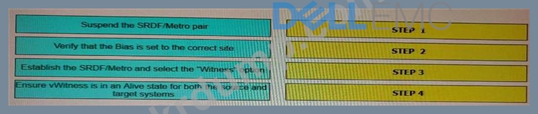 vWitness를 사용하여 SRDF/Metro 쌍이 생성됨 네트워크 중단 후 관리자가 SRDF 쌍이 ActiveBias 상태임을 발견함 SRDF 쌍을 ActiveActive 상태로 전환하는 올바른 이벤트 시퀀스는 무엇입니까?
