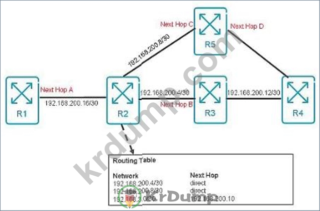 Referring to the exhibit, what is the next hop (A, B, C, or D) for traffic arriving at R2 and destination network 192.168.3.0?
