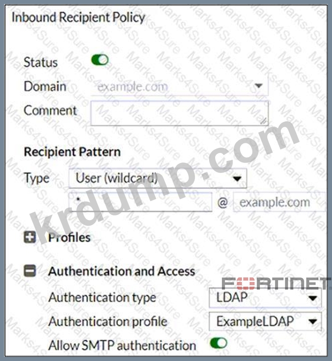 FortiMail은 보호된 도메인 example.com으로 구성됩니다.