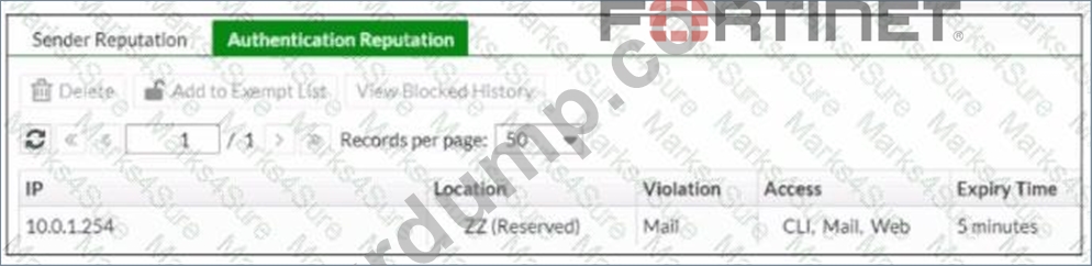 게이트웨이 모드에서 실행되는 FortiMail 장치의 인증 평판 목록을 보여주는 그림을 참조하세요.
