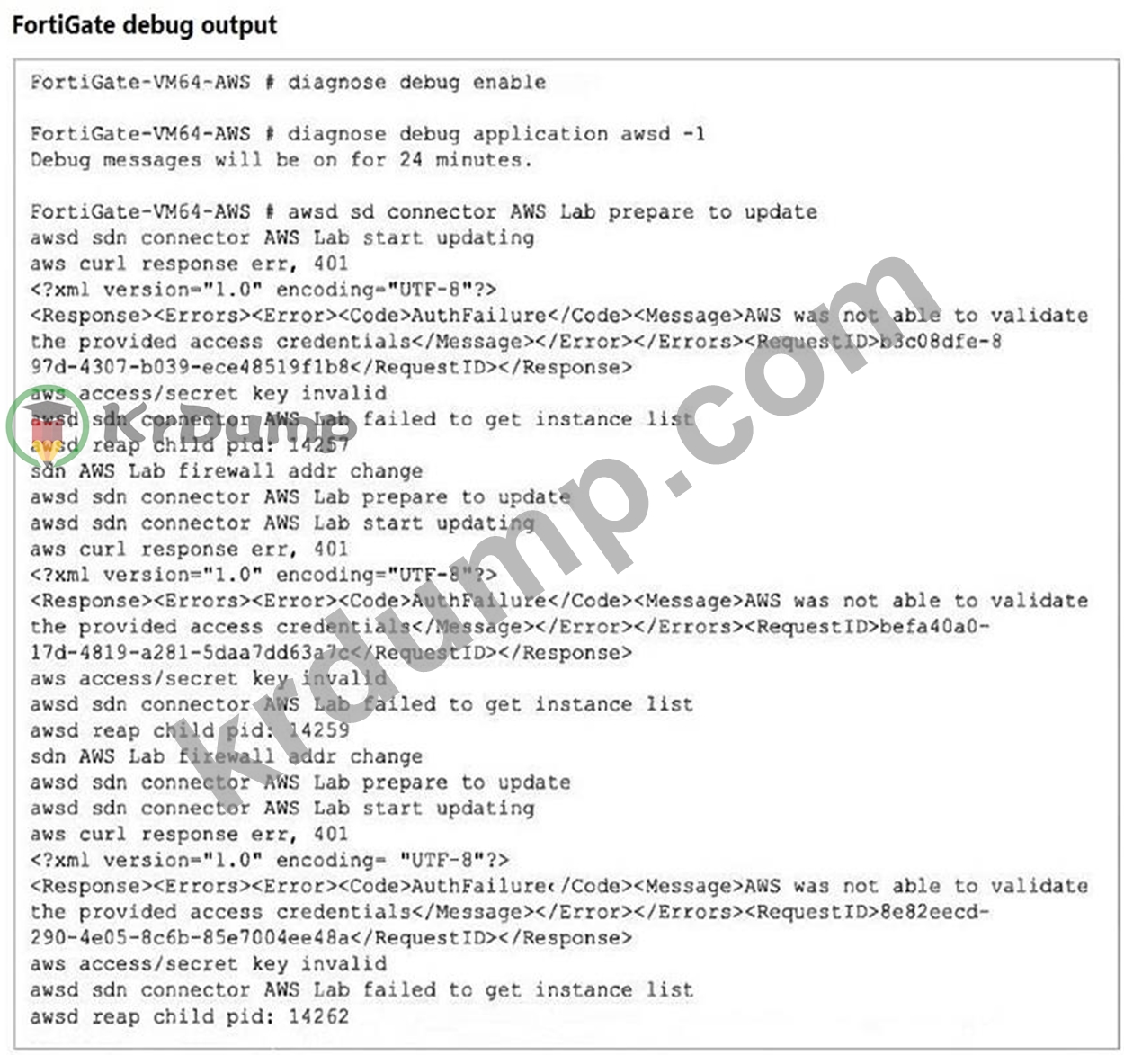 An administrator configured a FortiGate device to connect to the AWS API to retrieve resource values from the AWS console to create dynamic objects for the FortiGate policies. The administrator is unable to retrieve AWS dynamic objects on FortiGate.