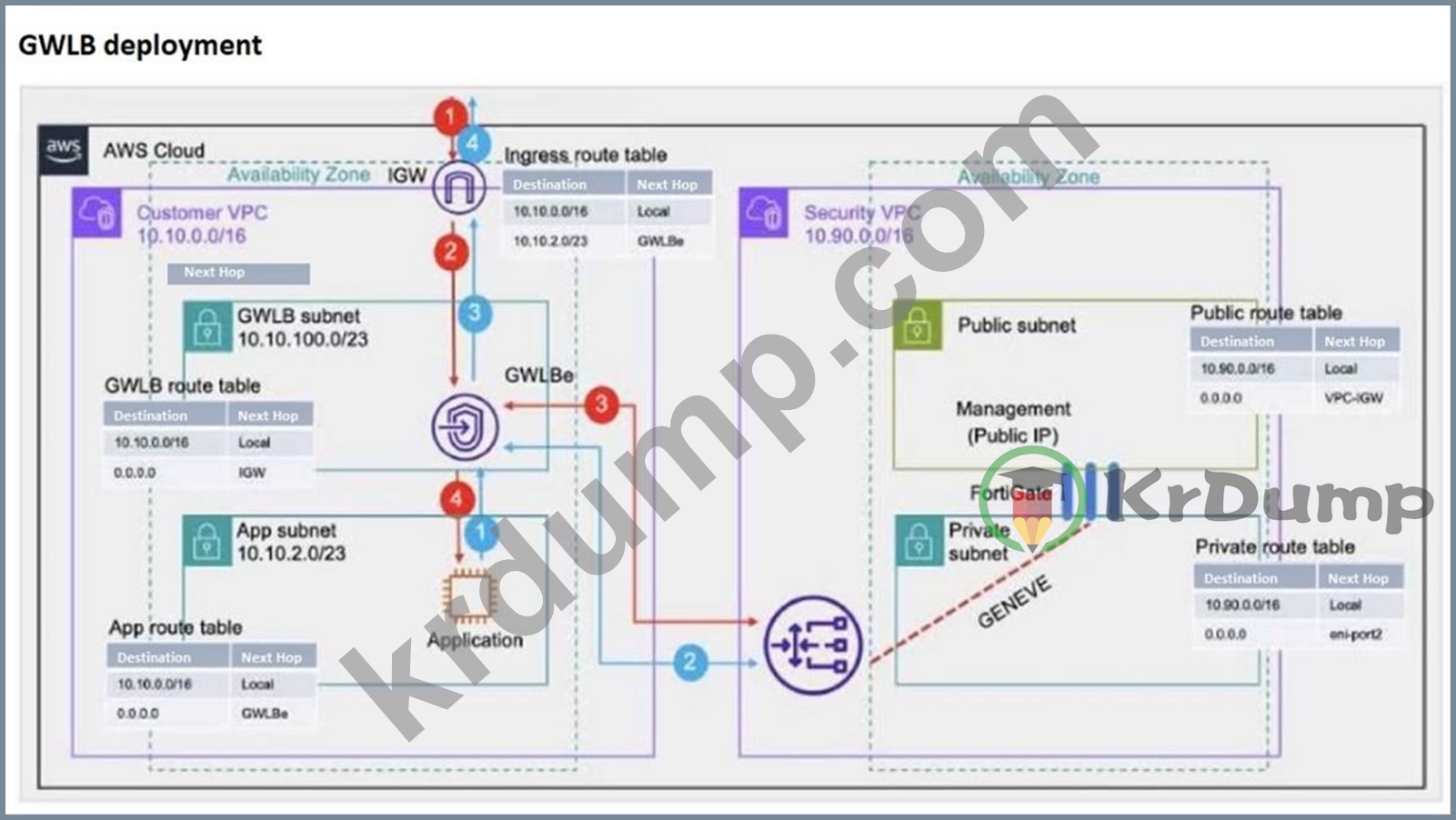 Which two statements are true about inbound traffic based on the IGW ingress route table and GWLB deployment shown in the exhibit? (Choose two.)