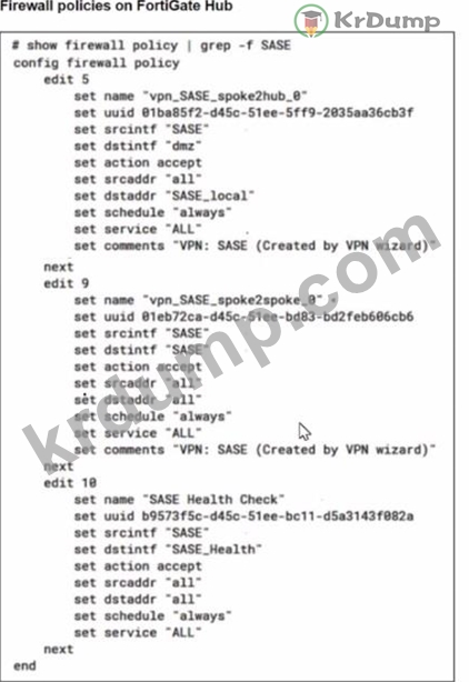 A FortiSASE administrator is trying to configure FortiSASE as a spoke to a FortiGate hub. The tunnel is up to the FortiGale hub. However, the administrator is not able to ping the webserver hosted behind the FortiGate hub.