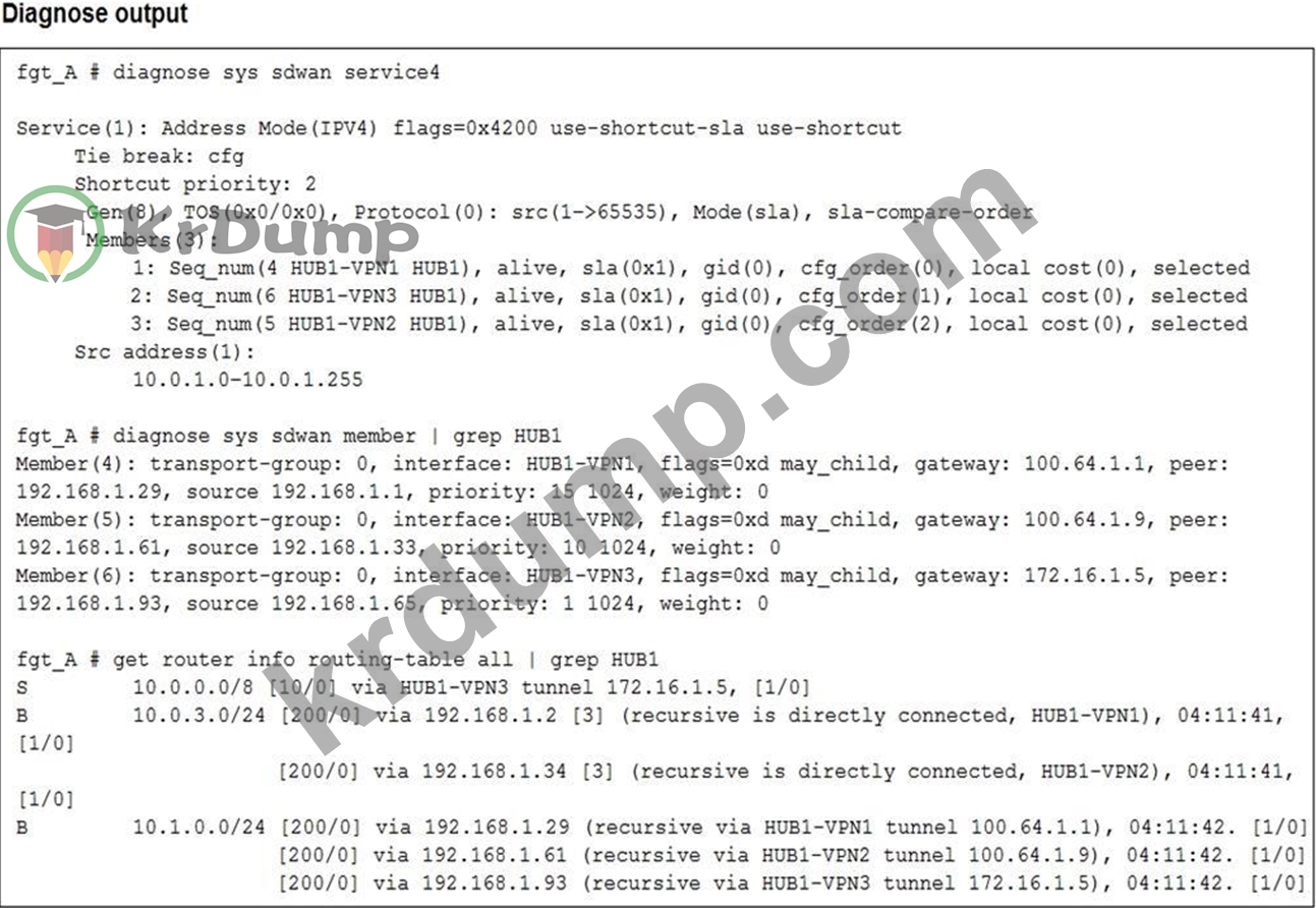 Refer to the exhibit. An administrator is troubleshooting SD-WAN on FortiGate. A device behind branch1_fgt generates traffic to the 10.0.0.0/8 network.