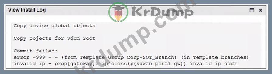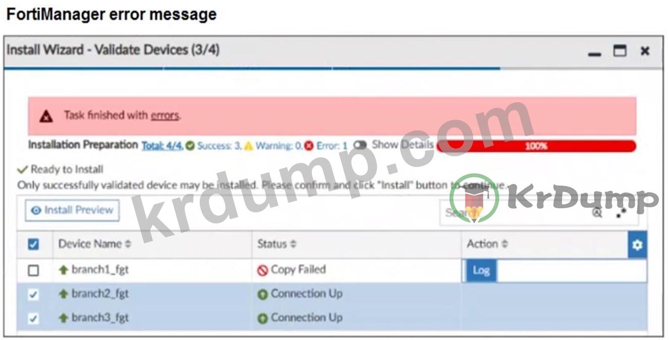 When you install the device settings. FortiManager prompts you with the error "Copy Failed" for the device branch1_fat When you click the log button. FortiManager displays the message shown in the exhibit.