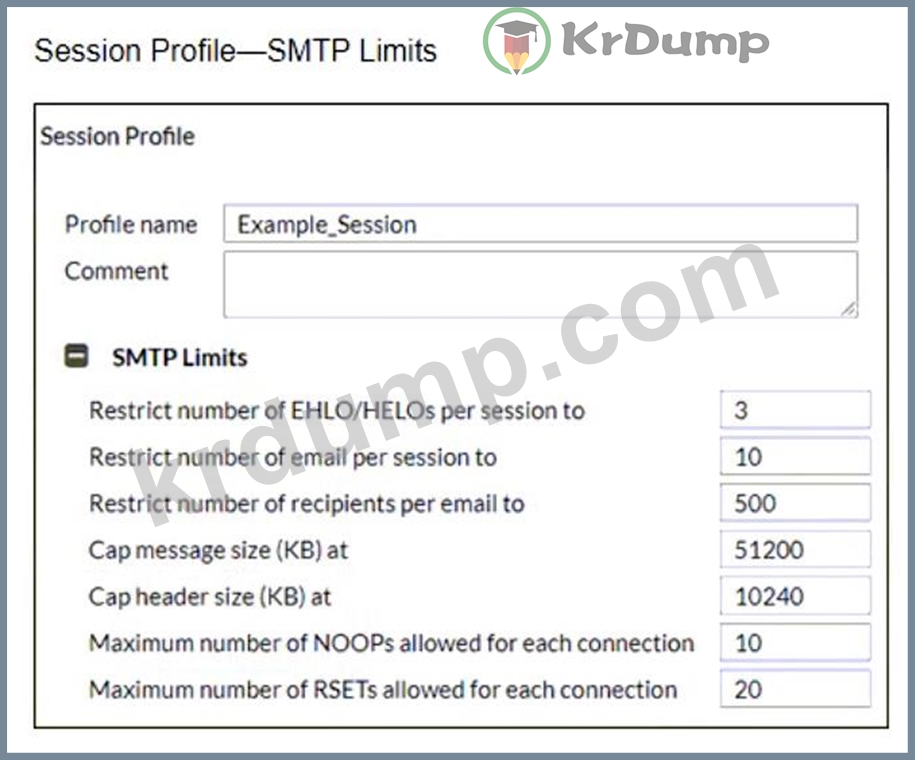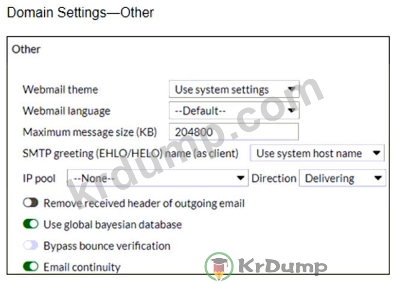 Refer to the exhibits showing SMTP limits (Session Profile - SMTP Limits), and domain settings (Domain Settings, and Domain Settings - Other) of a FortiMail device.