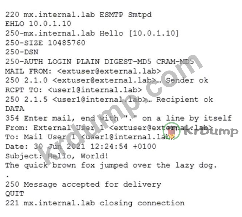 Refer to the exhibit which shows the output of an email transmission using a telnet session.