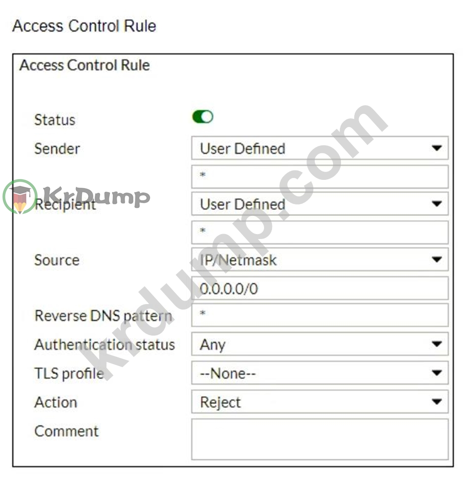 Which two settings should be used to configure the access receive rule? (Choose two.)