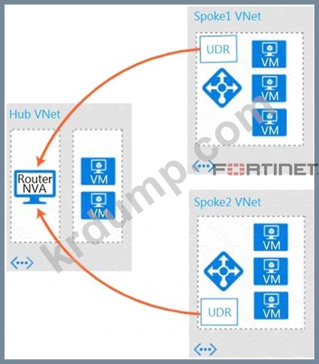 Microsoft Azure에서 허브와 스포크 간의 트래픽을 분리하고 보호할 수 있는 두 가지 조건은 무엇입니까? (두 가지를 선택하세요.)