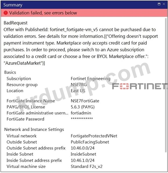 PAYG/주문형 라이선스 모델을 사용하여 Microsoft Azure에서 FortiGate-VM을 배포하고 있습니다. FortiGate-VM을 구성한 후 유효성 검사 프로세스가 실패하고 그림에 표시된 오류가 표시됩니다.