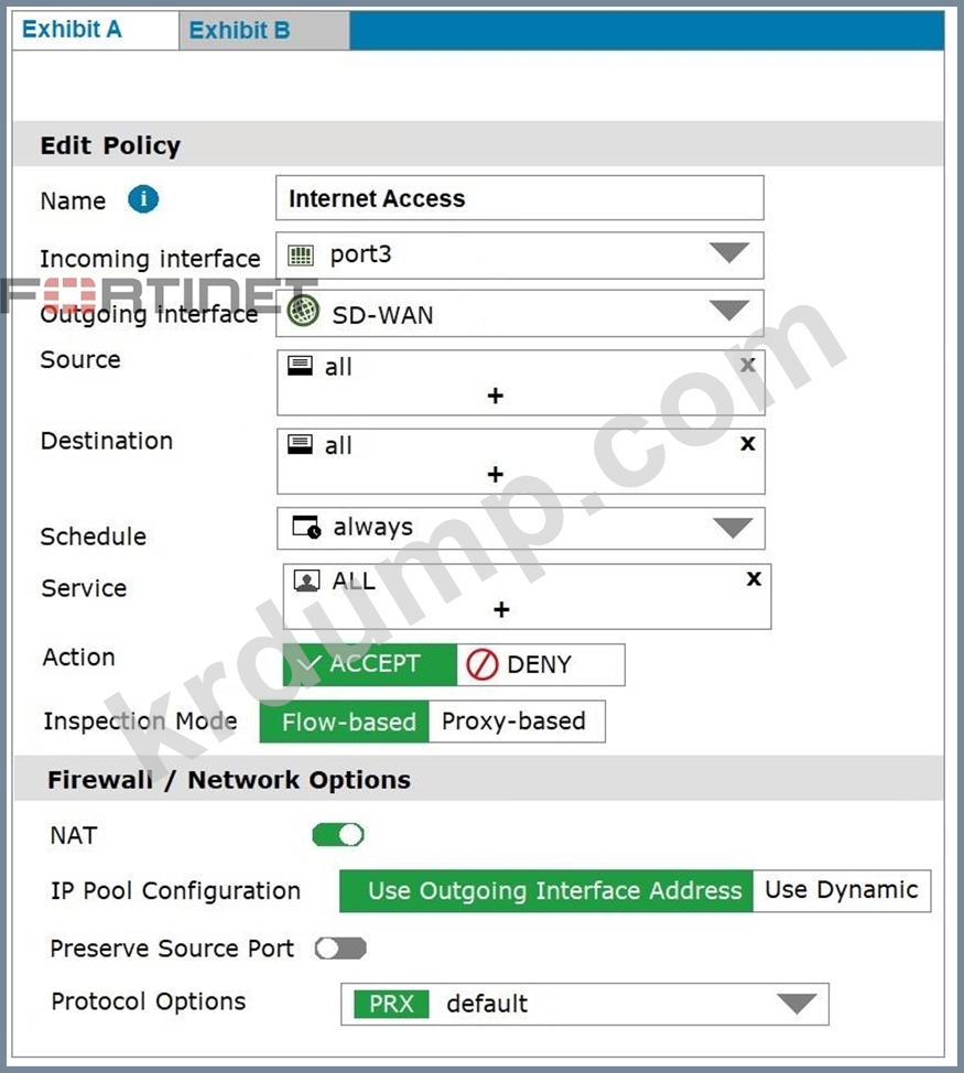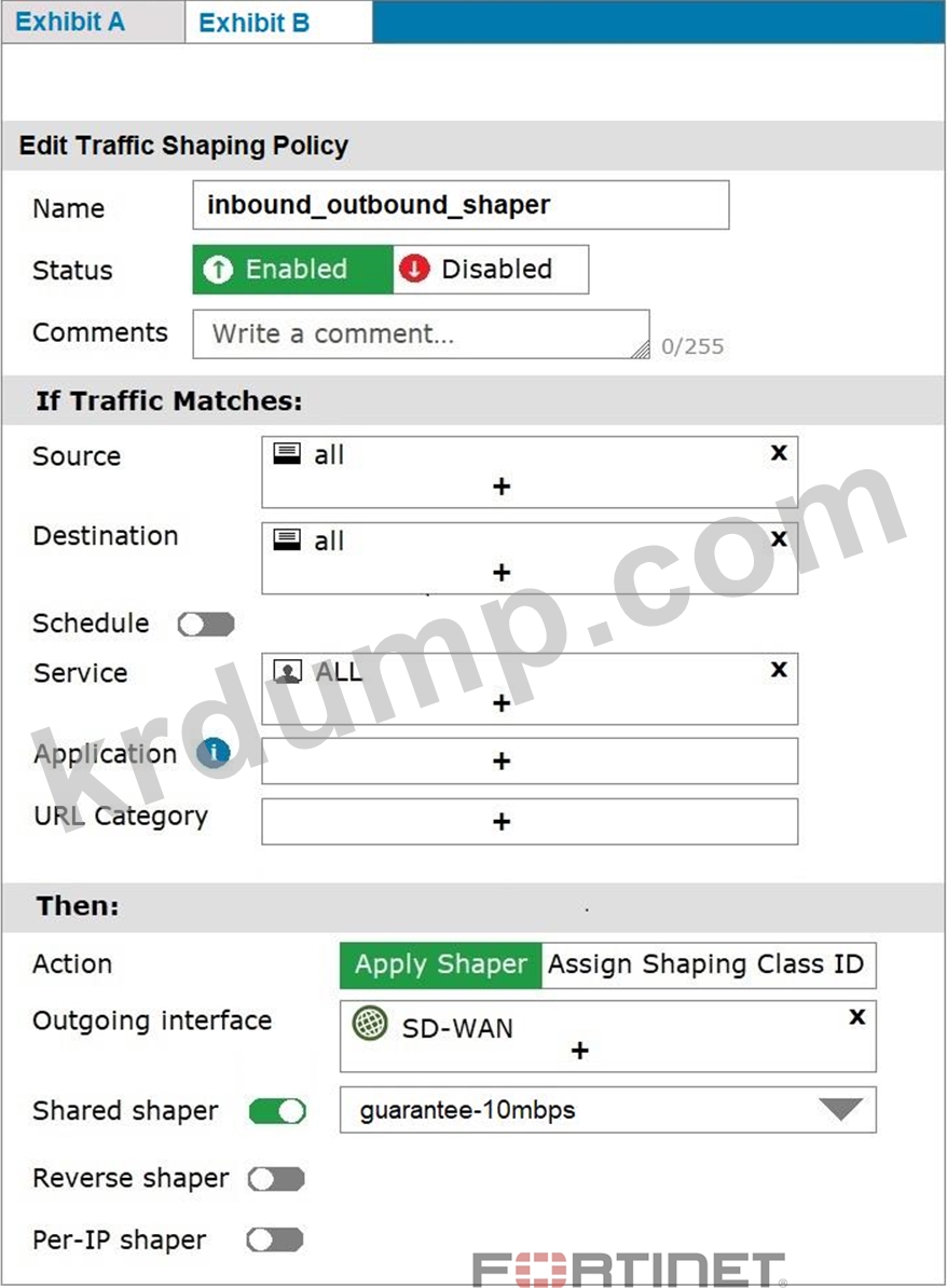 Exhibit A는 방화벽 정책을 보여주고 Exhibit B는 트래픽 쉐이핑 정책을 보여줍니다.