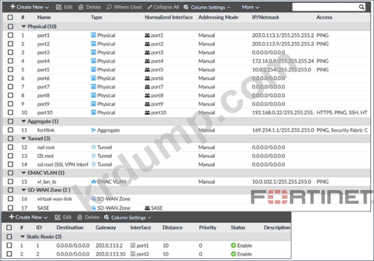 그림에 표시된 FortiGate 구성을 기반으로, 포트 1과 포트 2에 SD-WAN 영역을 생성할 때 어떤 문제가 발생할 수 있습니까?