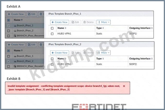 표 B는 관리자가 FortiGate 장치에 두 번째 템플릿을 할당하려고 했을 때 FortiManager가 표시한 오류 메시지를 보여줍니다.