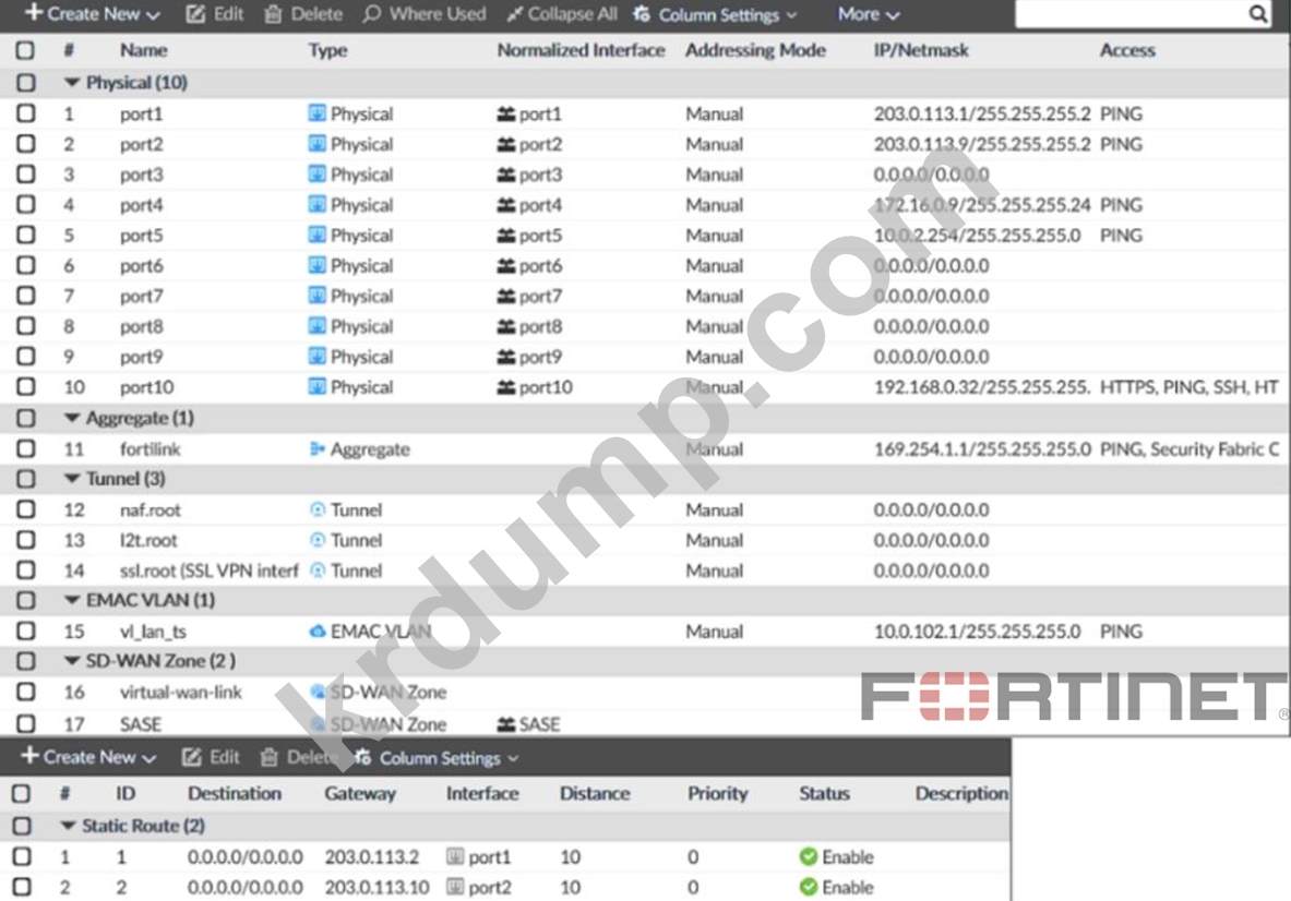 그림에 표시된 FortiGate 구성을 기반으로, 포트 1과 포트 2에 SD-WAN 영역을 생성할 때 어떤 문제가 발생할 수 있습니까?