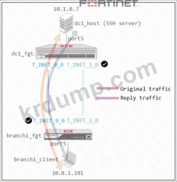 branch1_client가 dc1_host에 연결을 설정하면 관리자는 dc1_fgt에서 응답 트래픽이 T_INET_0_0을 통해 라우팅되는 것을 확인하는데, 이는 일치하는 SD-WAN 규칙에서 T_INET_1_0이 기본 멤버임에도 불구하고 그렇습니다.