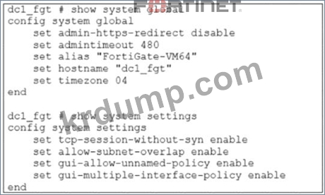 표 A는 두 FortiGate 장치(branch1_fgt와 dc1_fgt) 간의 사이트 간 토폴로지를 보여줍니다. 표 B는 dc1_fgt의 시스템 전역 및 시스템 설정 구성을 보여줍니다.