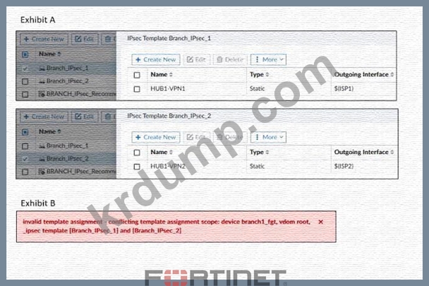 표 B는 관리자가 FortiGate 장치에 두 번째 템플릿을 할당하려고 했을 때 FortiManager가 표시한 오류 메시지를 보여줍니다.