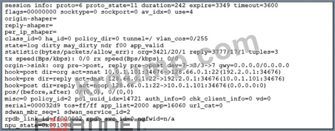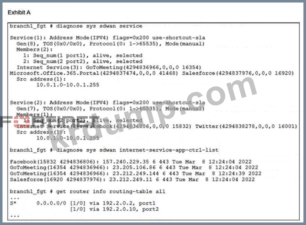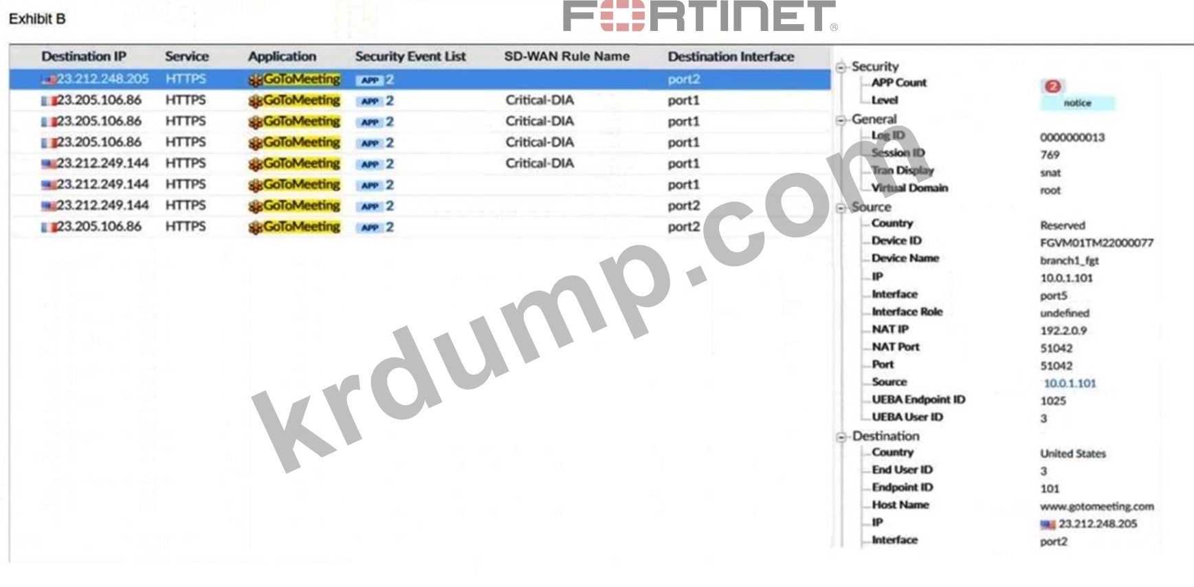 관리자는 GoToMeeting 테스트 트래픽을 생성한 후 표 B에 표시된 FortiAnalyzer의 해당 트래픽 로그를 조사했습니다. 관리자는 트래픽이 암묵적 SD-WAN 규칙과 일치한다는 것을 알아챘지만 트래픽이 규칙 ID 1과 일치할 것으로 예상했습니다.