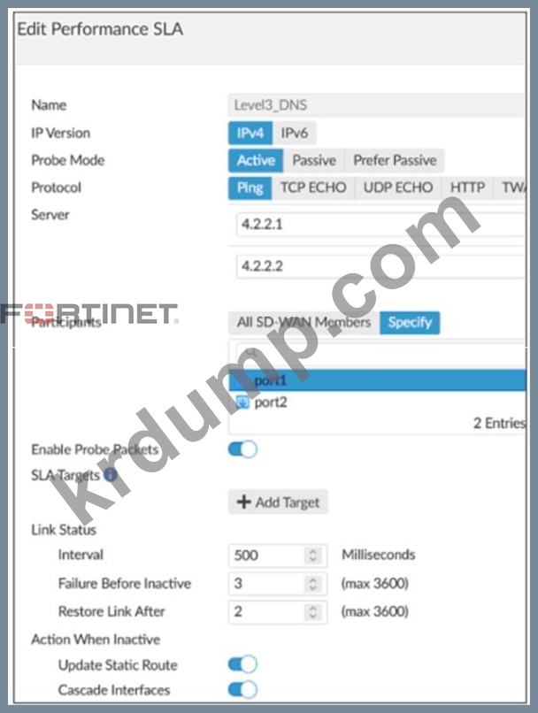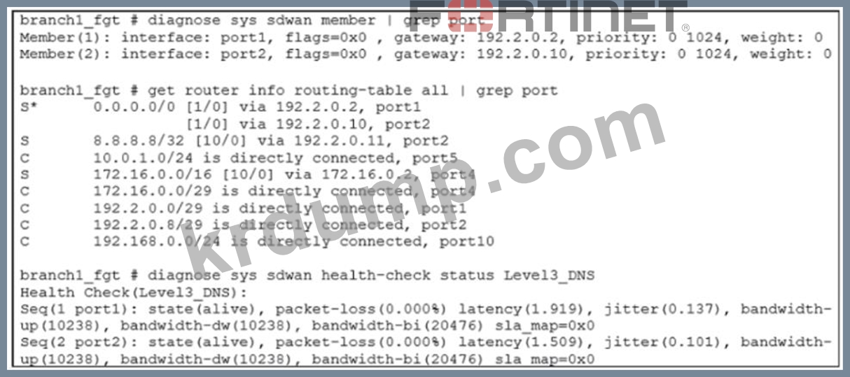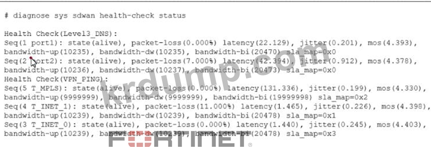 이 그림은 FortiGate 장치에서 수집된 "diagnostic sys sdwan health-check status" 명령의 출력을 보여줍니다. 이 FortiGate 장치의 상태 점검 상태에 대한 두 가지 설명 중 올바른 것은 무엇입니까? (두 가지 선택)