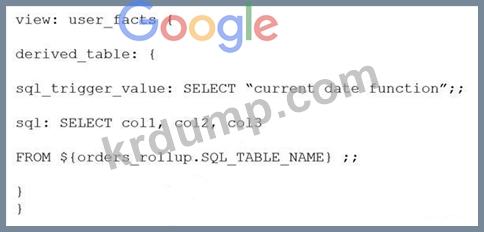 LookML 개발자는 다음과 같은 영구 파생 테이블을 작성했습니다. 동일한 SQL 트리거 값으로 다시 빌드하는 또 다른 영구 파생 테이블인 orders_rollup을 참조합니다.
