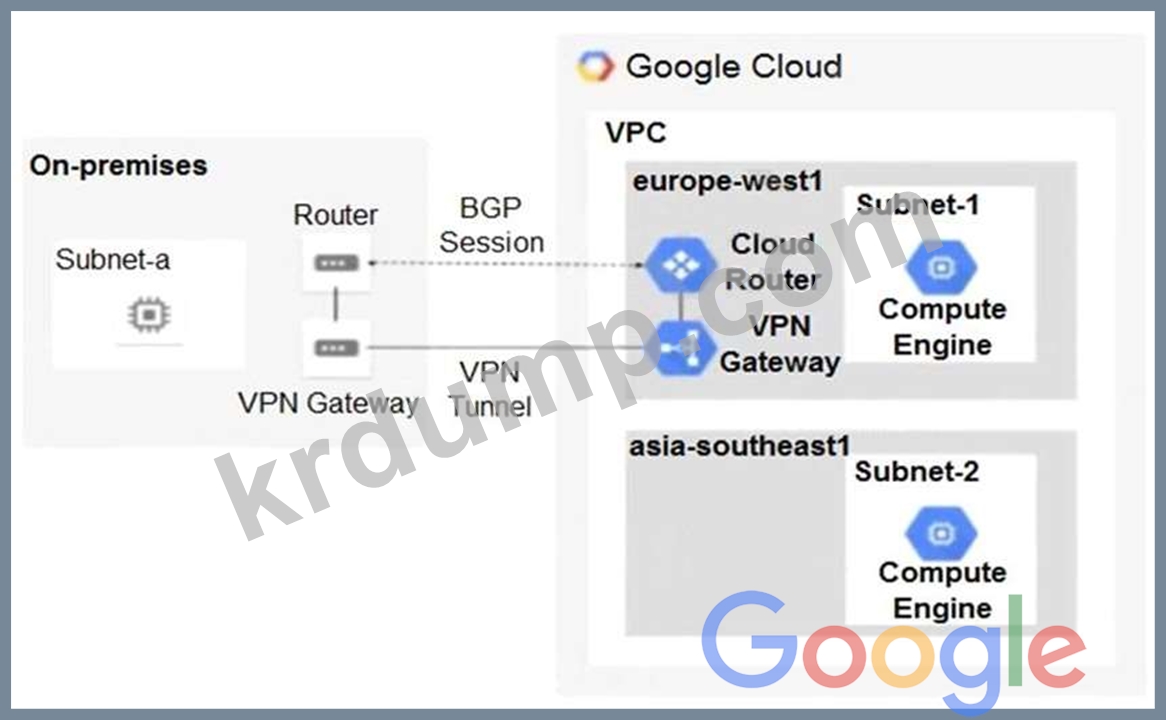 다음 라우팅 디자인이 있습니다. asia-southeast1 지역의 Subnet-2에 있는 Compute Engine 인스턴스가 온프레미스 컴퓨팅 리소스와 통신할 수 없음을 발견했습니다. 당신은 무엇을해야합니까?