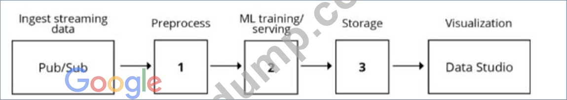 실시간 센서 데이터에서 이상을 감지하기 위해 ML 모델을 구축 중입니다. Pub/Sub를 사용하여 수신 요청을 처리합니다. 분석 및 시각화를 위해 결과를 저장하려고 합니다. 파이프라인을 어떻게 구성해야 합니까?
