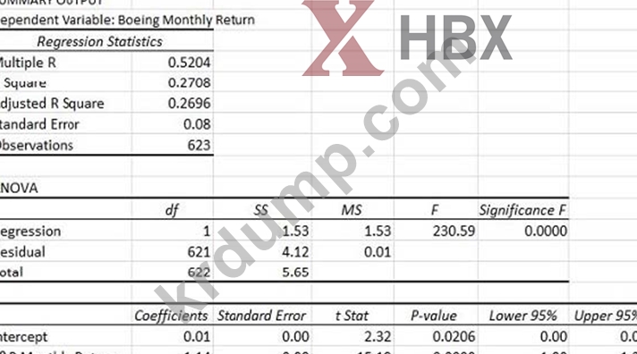 금융에서 베타는 시장 전체와 비교하여 유가 증권의 체계적인 위험을 측정합니다. 베타는 유가 증권의 월별 수익률과 일반 시장의 월별 수익률에 대한 회귀 분석을 실행하여 찾을 수 있습니다. 아래 회귀 출력표는 보잉의 월별 수익률과 500대 대기업의 주식시장 지수인 스탠더드앤드푸어스(S&P) 500(S&P 500) 월별 수익률의 관계를 나타낸 것이다.
