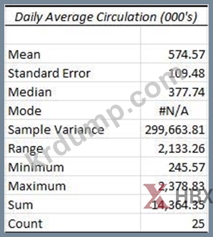 아래 데이터는 2013년 평균 일간 부수(천 단위) 기준 미국 상위 25개 신문을 나타냅니다. 출력을 기준으로 이 표본의 표준 편차는 얼마입니까?