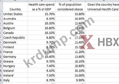 연구원은 비만과 보편적인 건강 관리가 국내 총생산(GDP)의 백분율로 측정되는 국가의 의료 지출 금액에 미치는 영향을 알고 싶어합니다. 연구자는 30개국에서 비만으로 간주되는 인구의 비율과 해당 국가가 시민에게 보편적인 의료 서비스를 제공하는지 여부에 대한 데이터를 수집합니다. 더미 변수는 후자를 측정하기 위해 구성됩니다. 변수는 보편적 의료 서비스를 제공하는 국가의 경우 1로, 그렇지 않은 국가의 경우 0으로 설정됩니다. 연구원은 이 두 변수가 의료비 지출에 미치는 영향을 측정하기 위해 회귀 분석을 설정하려고 합니다. 데이터의 일부 보기가 아래에 표시됩니다.