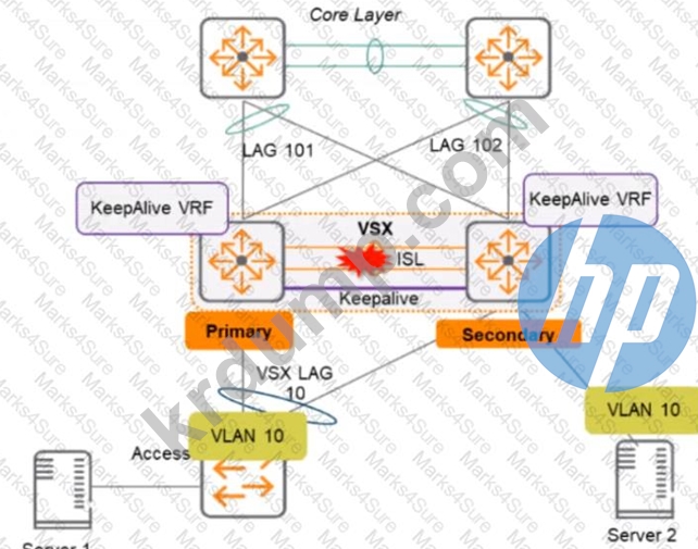 두 개의 AOS-CX 스위치가 서버가 연결되는 액세스-애그리게이션 계층에서 VSX로 구성되어 있습니다. SVI 인터페이스는 VLAN 10에 구성되어 VLAN 10의 기본 게이트웨이 역할을 합니다. 스위치 간 ISL 링크는 실패하지만 keepalive 인터페이스는 작동합니다. VSX 스위치에는 액티브 게이트웨이가 구성되어 있습니다.