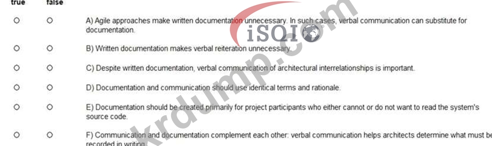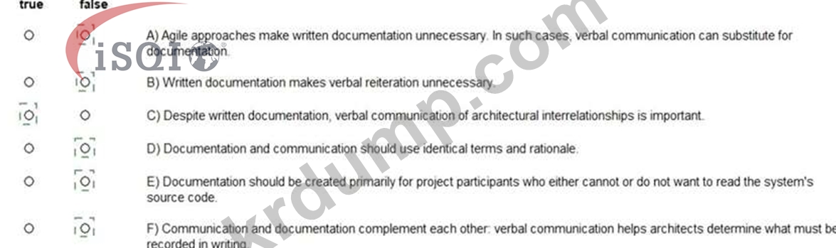 소프트웨어 아키텍처의 서면 문서 및 구두 의사 소통은 어떻게 관련되어 있습니까? 다음 진술을 참 또는 거짓으로 표시하십시오. (모든 답을 할당합니다.)