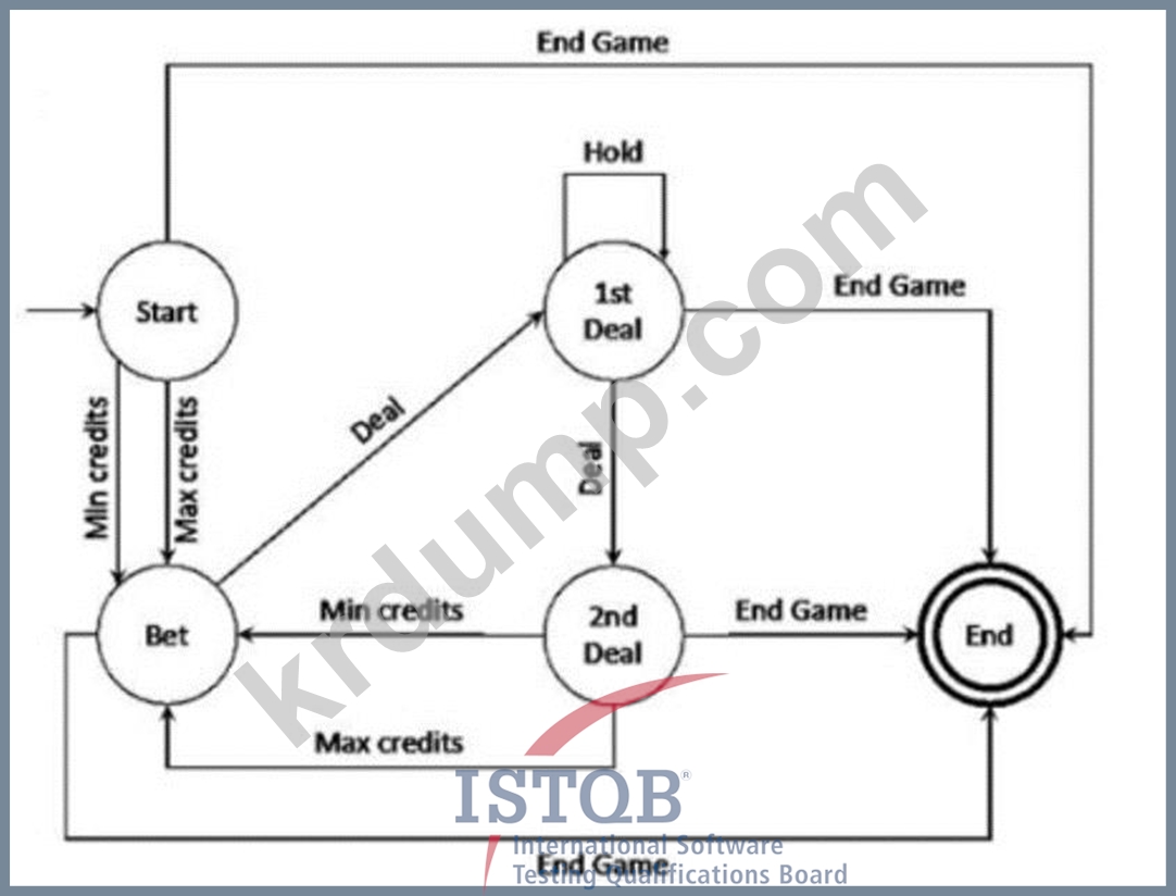 비디오 포커 게임의 동작을 지정하는 상태 전환 다이어그램의 다음 단순화된 버전을 고려하세요.