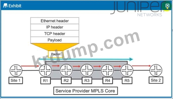 그림에 표시된 것처럼 패킷이 서비스 제공업체 MPLS 네트워크를 통과하여 사이트 1에서 사이트 2로 이동할 때 취한 조치에 대해 올바르게 설명한 두 문장은 무엇입니까? (두 가지를 선택하세요.)