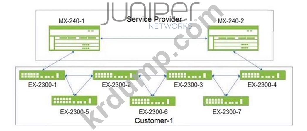 고객 1은 서비스 공급자가 STP가 모든 포트에서 정상적으로 작동하도록 허용하지만 MX 시리즈 장치만 레이어 2 토폴로지를 관리하도록 허용하기를 원합니다.