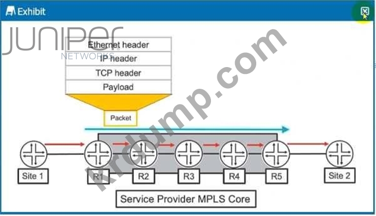 그림에 표시된 것처럼 패킷이 서비스 제공업체 MPLS 네트워크를 통과하여 사이트 1에서 사이트 2로 이동할 때 취한 조치에 대해 올바르게 설명한 두 문장은 무엇입니까?