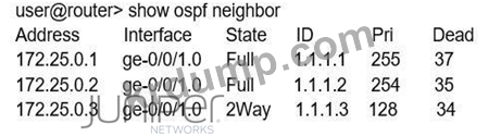 그림을 참조하면, ge-0/0/1 인터페이스에 대한 올바른 OSPF 인터페이스 상태는 무엇입니까?