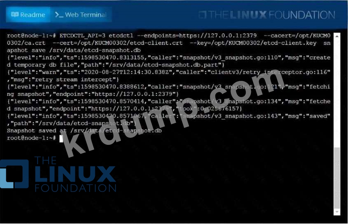https://127.0.0.1:2379에서 실행 중인 etcd 인스턴스의 스냅샷을 생성하고 스냅샷을 파일 경로에 저장합니다.