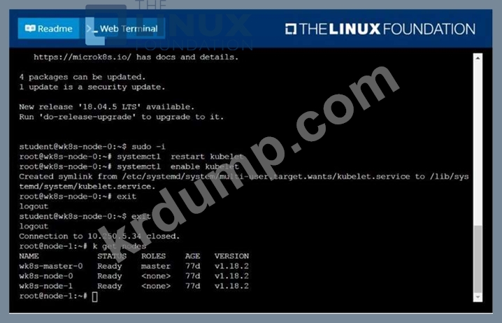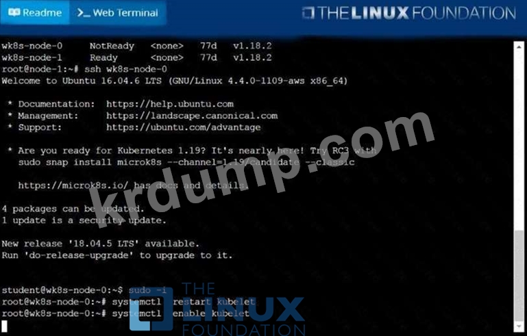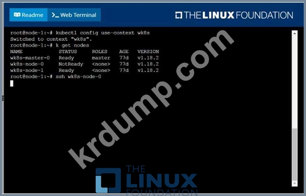 이름이 wk8s-node-0인 Kubernetes 작업자 노드는 NotReady 상태입니다. 왜 그런지 조사하고 적절한 단계를 수행하여 노드를 상태로 전환하여 변경 사항이 영구적으로 적용되도록 합니다.