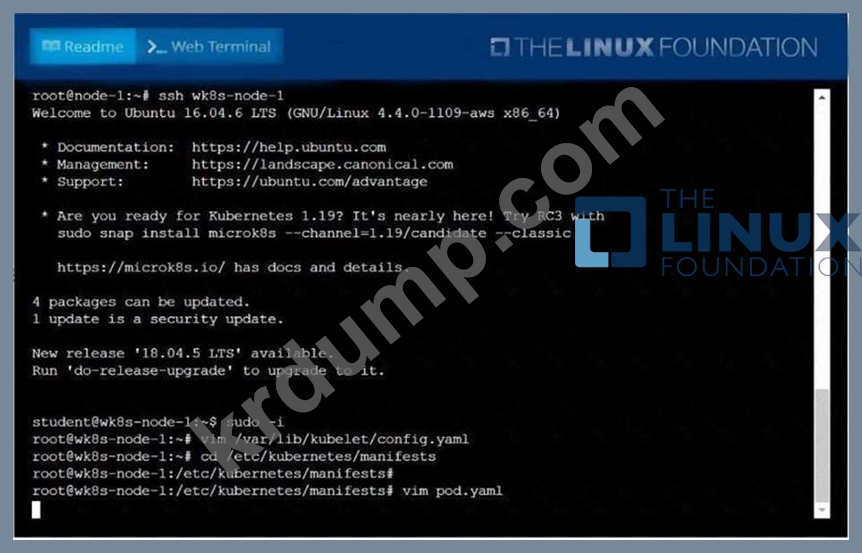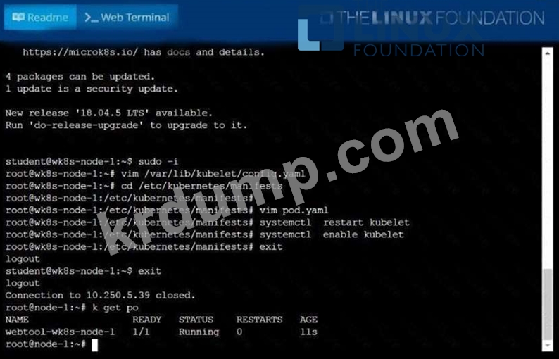 name=wk8s-node-1로 레이블이 지정된 노드에서 kubelet systemd-managed 서비스를 구성하여 webtool이라는 Image httpd의 단일 컨테이너를 포함하는 포드를 자동으로 시작합니다. 필요한 사양 파일은 노드의 /etc/kubernetes/manifests 디렉토리에 있어야 합니다.