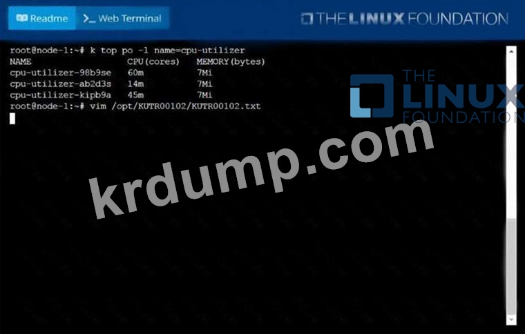 포드 레이블 name=cpu-utilizer에서 높은 CPU 워크로드를 실행하는 포드를 찾고 대부분의 CPU를 소비하는 포드의 이름을 /opt/KUTR00102/KUTR00102.txt(이미 존재함) 파일에 씁니다.