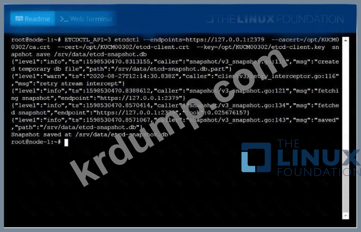 Create a snapshot of theetcdinstance running at , saving thesnapshot to the file path