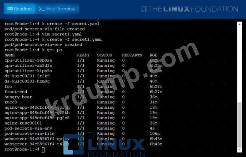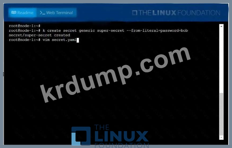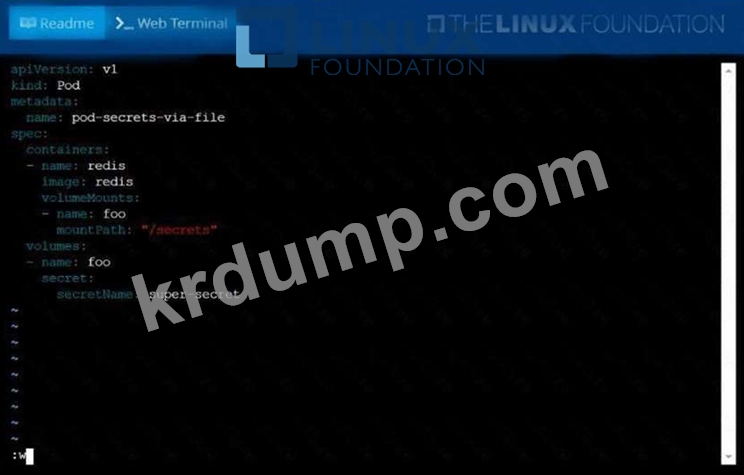 Create a pod named pod-secrets-via-file, using the redis Image, which mounts a secret named super-secret at