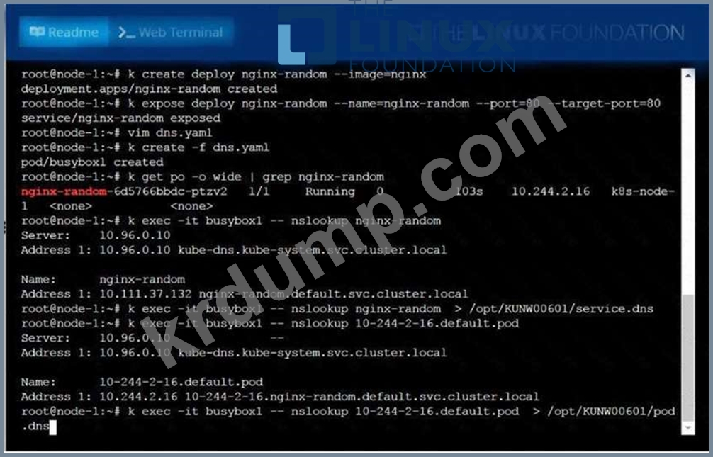* 이 배포의 일부로 실행되는 모든 포드 내의 컨테이너는 thenginxImage를 사용해야 합니다. 다음으로, nslookup 유틸리티를 사용하여 서비스 및 포드의 DNS 레코드를 조회하고