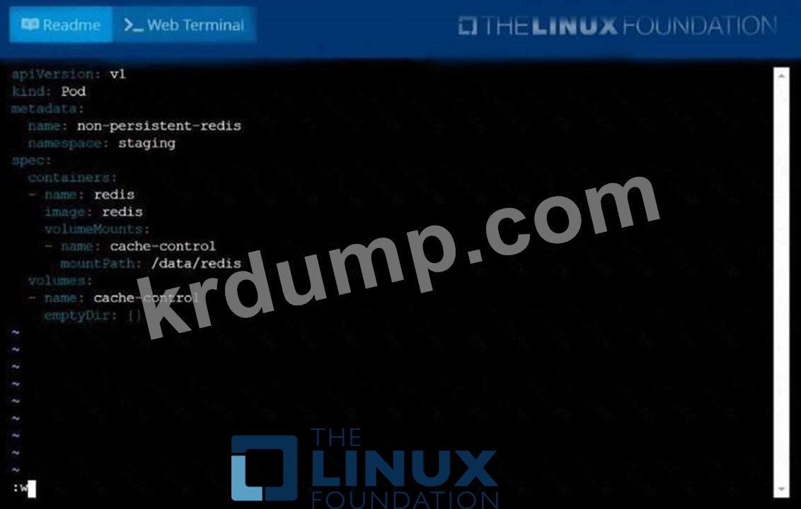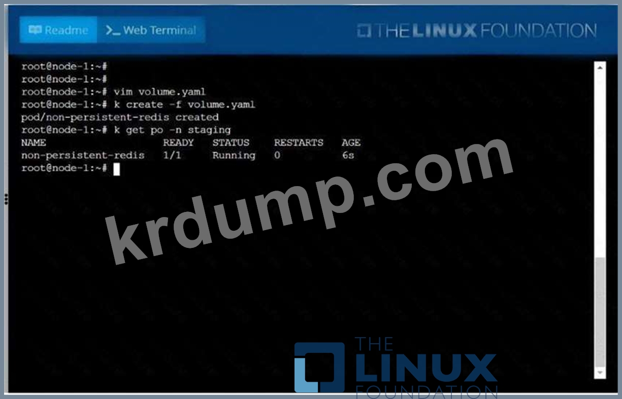 apiVersion: v1kind: Podmetadata: creationTimestamp: null 이름: app-dataspec: 볼륨: - 이름:congigpvc persisenVolumeClaim: claimName: 앱 데이터 컨테이너: - 이미지: nginx 이름: 앱 볼륨 마운트: - mountPath: "/srv/app-data" 이름: configpvc